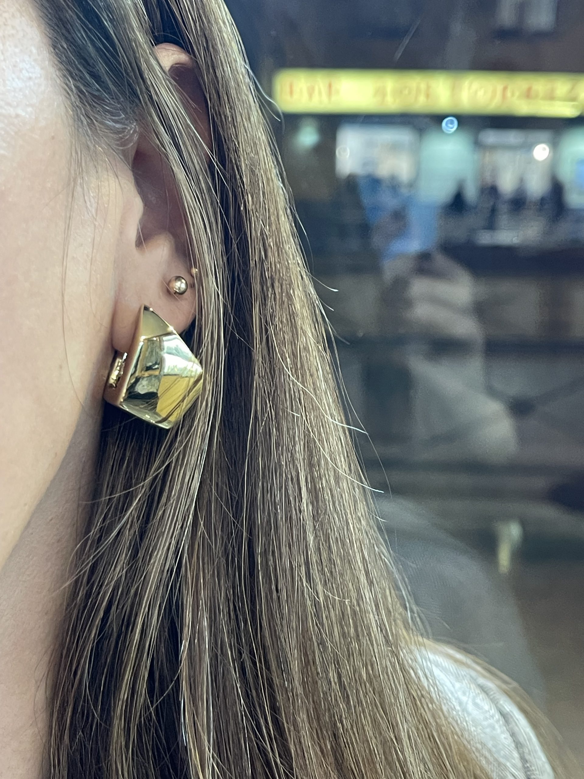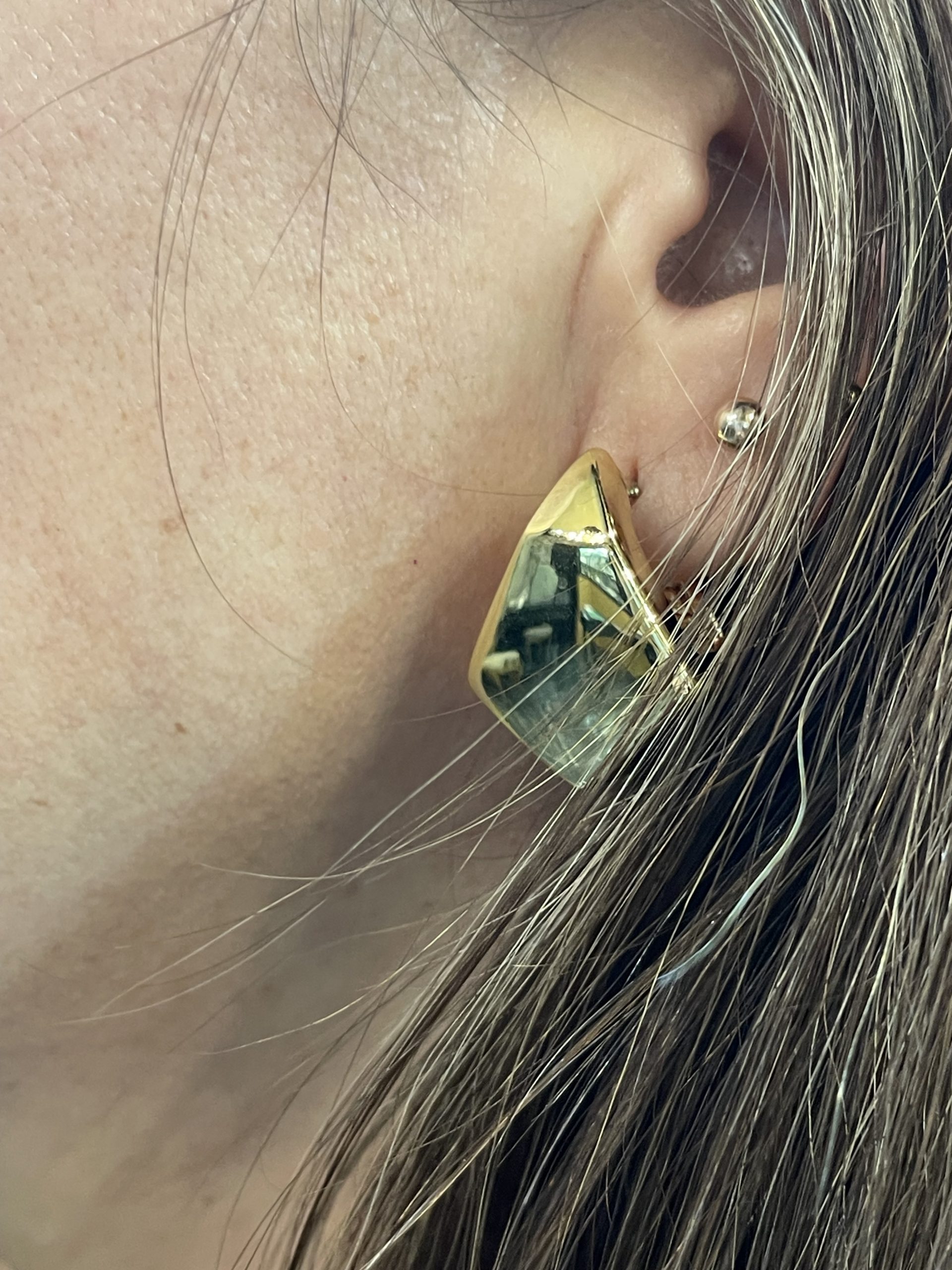 Pendientes triangulares de oro de 18kts, destacan por su diseño moderno y minimalista, perfectos para quién busca una joya única y sofisticada.