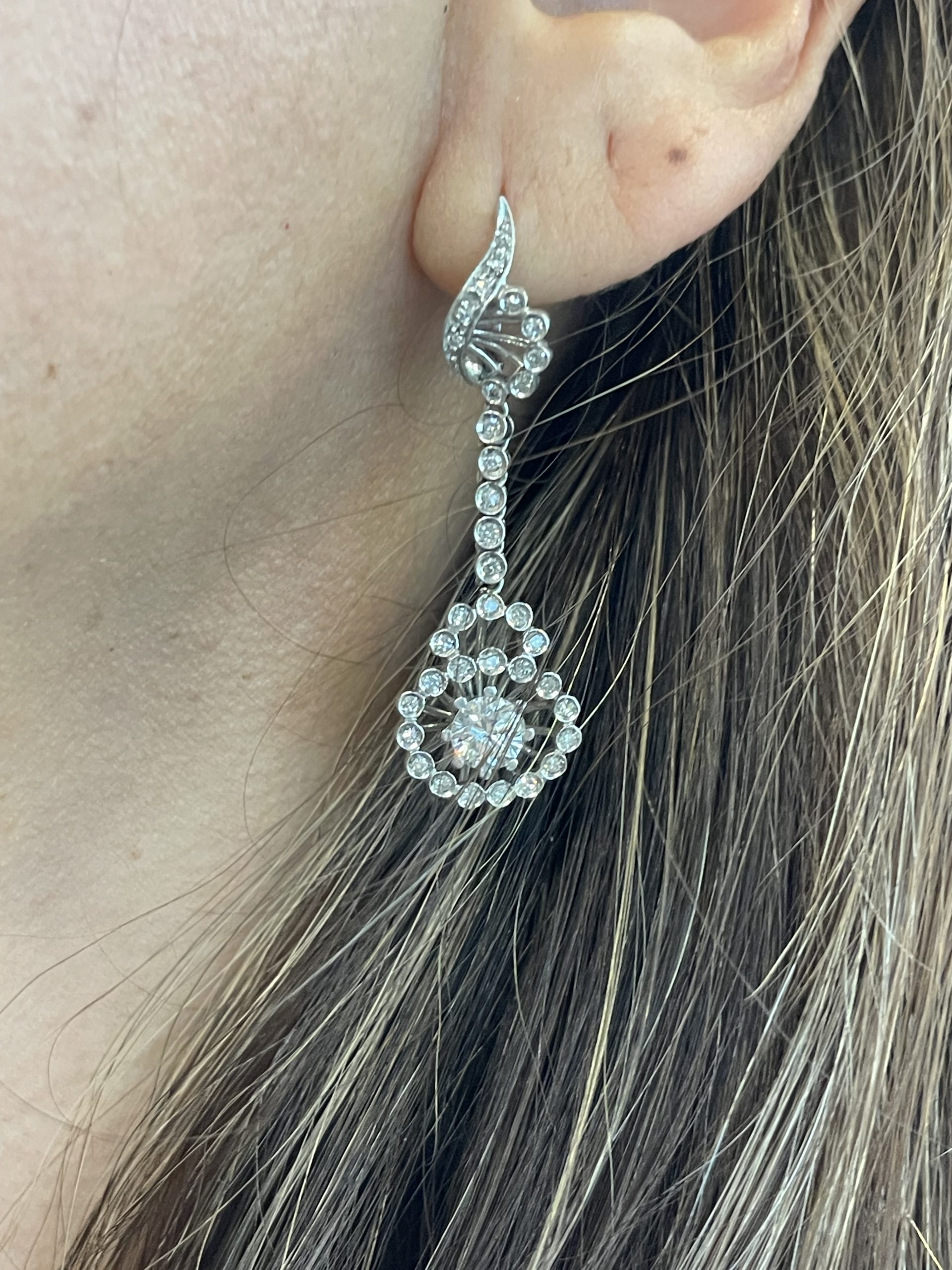 Elegante, pendientes largos antiguos de oro blanco 18kst con brillantes en cascada y un diamante central.