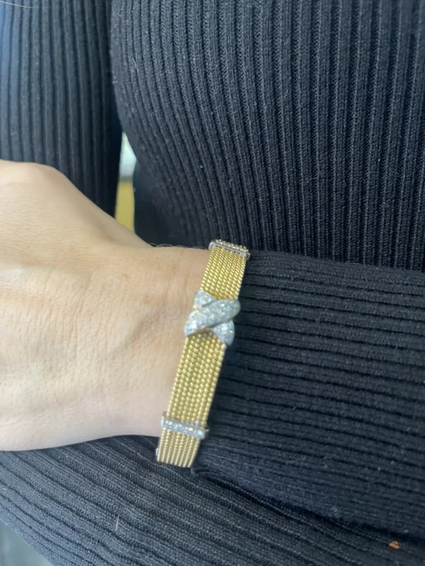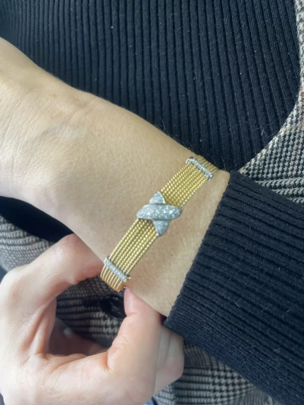 La combinación del oro amarillo, el oro blanco y el destello de los diamantes confiere a esta pieza un carácter sofisticado y atemporal, propio de la alta joyería antigua. Su diseño equilibrado lo convierte en un brazalete versátil, ideal tanto para ocasiones especiales como para lucir como joya protagonista en el día a día.