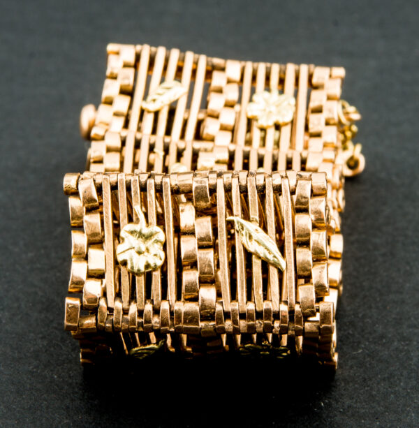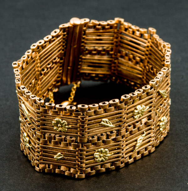Brazalete antiguo ancho con motivos florales y hojas en oro de Ley 18 quilates.