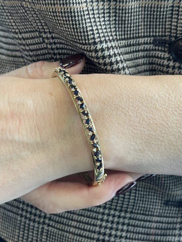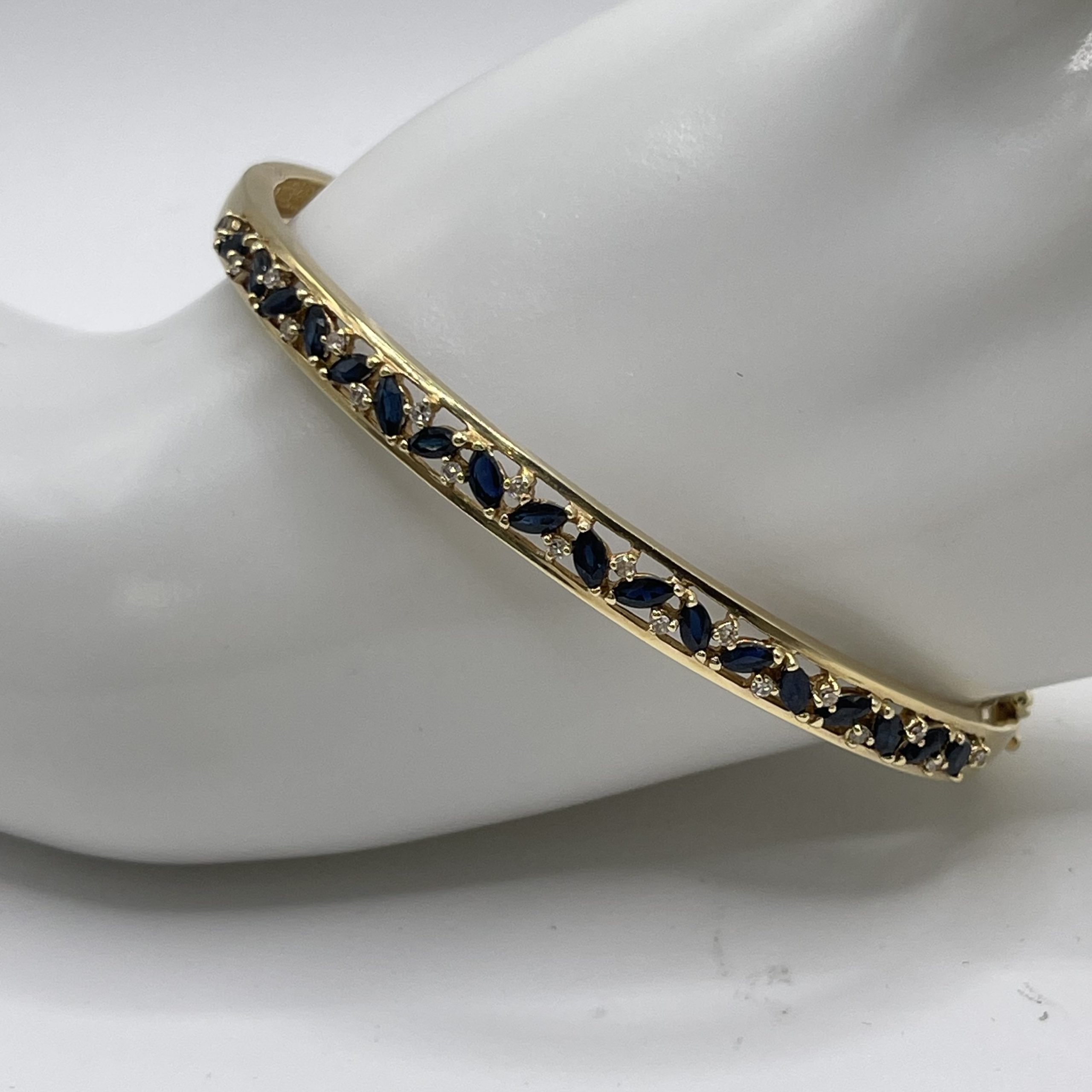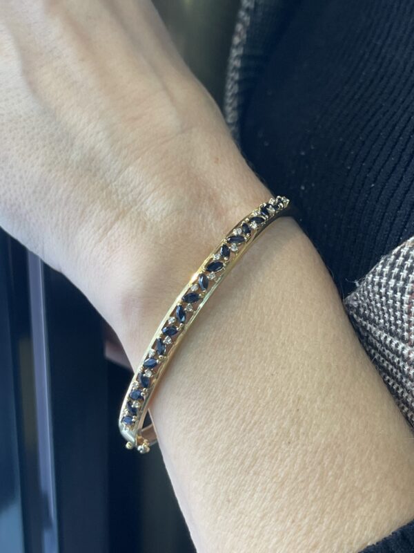 Este brazalete de diamantes y zafiros es una joya vintage de extraordinaria belleza, realizada en oro amarillo de 18 quilates y concebida para destacar por su equilibrio perfecto entre color, brillo y elegancia clásica.