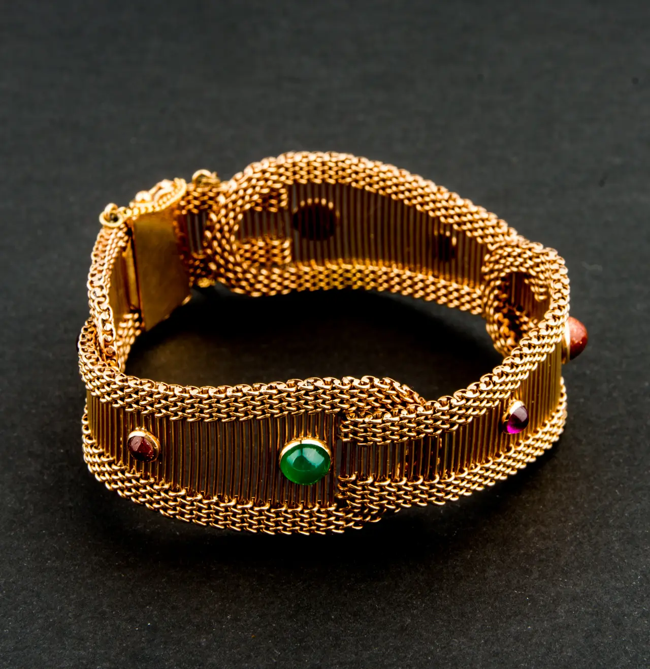 Brazalete antiguo de oro amarillo 18 quilates con piedras de colores.