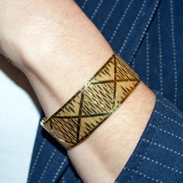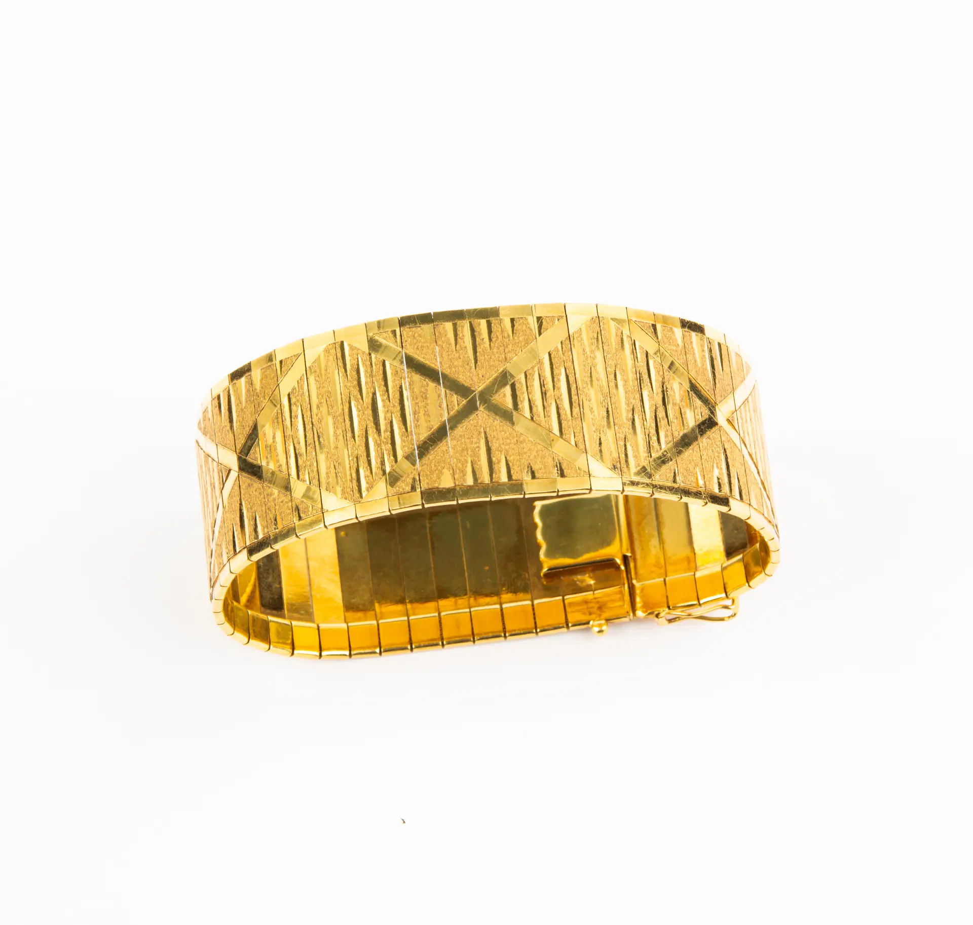 Brazalete antiguo de motivos X en oro amarillo de Ley 18 quilates.