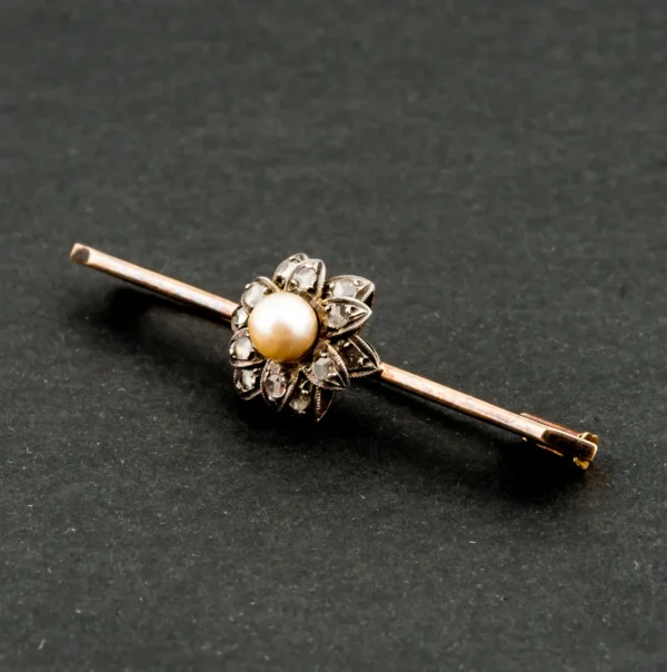 Broche antiguo bicolor con brillantes y perla.