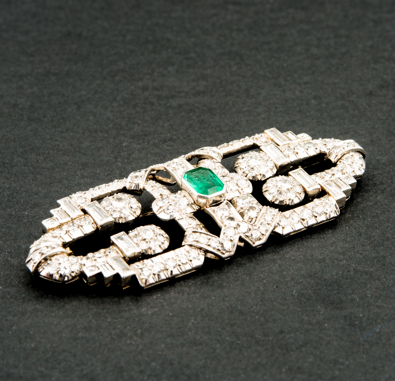 Broche antiguo de oro blanco con diamantes y esmeraldas