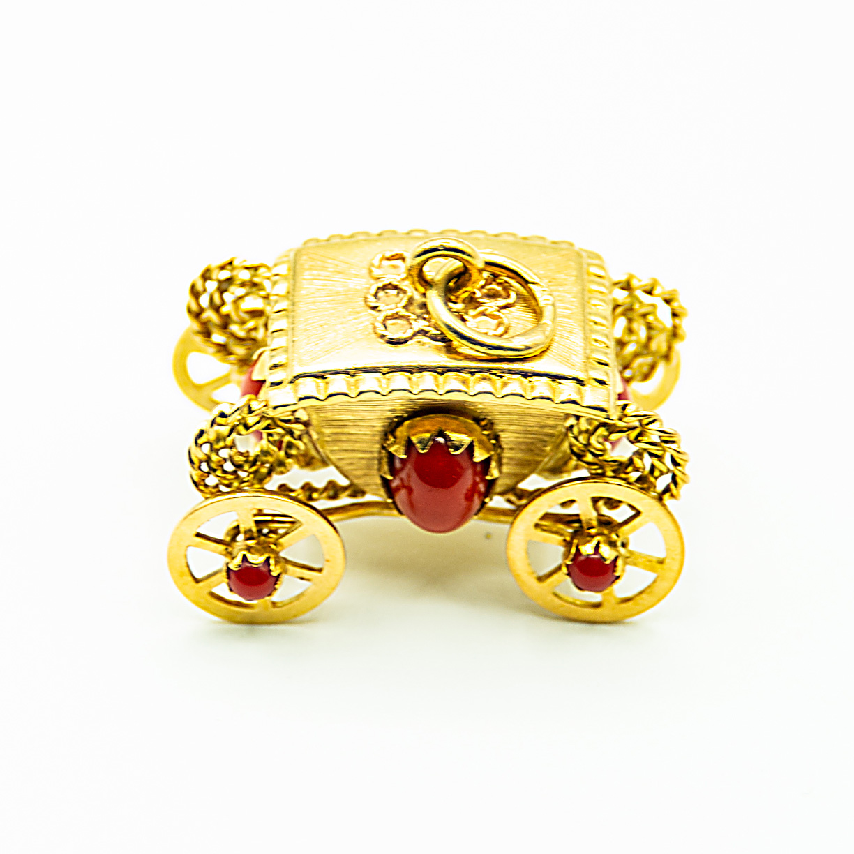 Colgante carruaje antiguo de oro amarillo con coral.