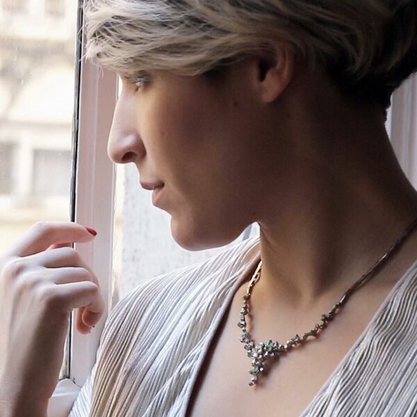 Gargantilla antigua en oro blanco de Ley 18 quilates con diamantes talla brillante redonda diferentes tamaños y esmeraldas naturales talla marquises.
