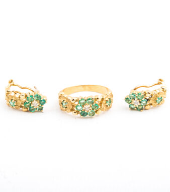Juego de sortija y pendientes antiguo isabelino con roseta de oro con diamantes