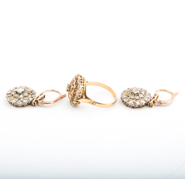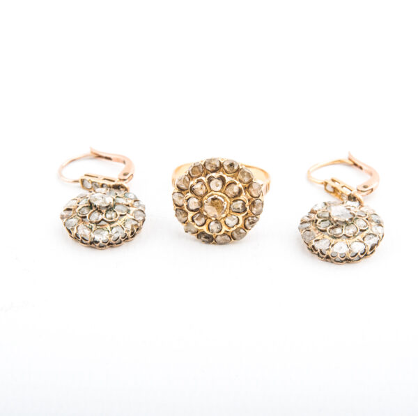 Juego de sortija y pendientes antiguo isabelino con roseta de oro amarillo con diamantes.