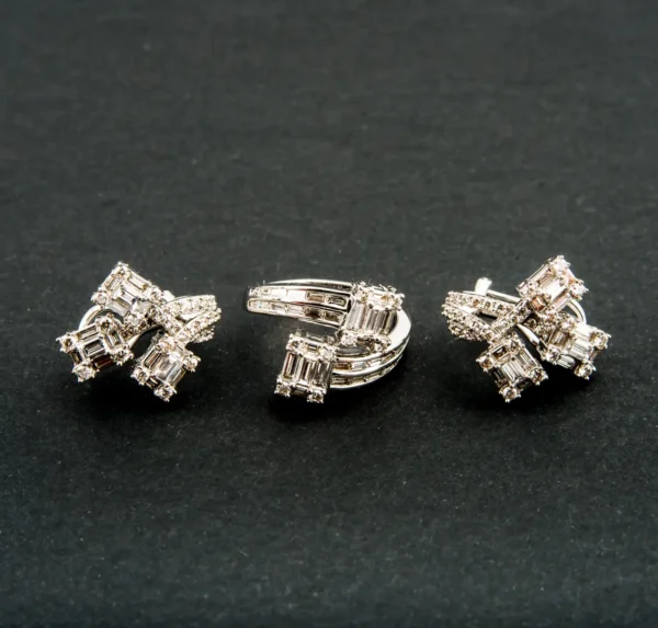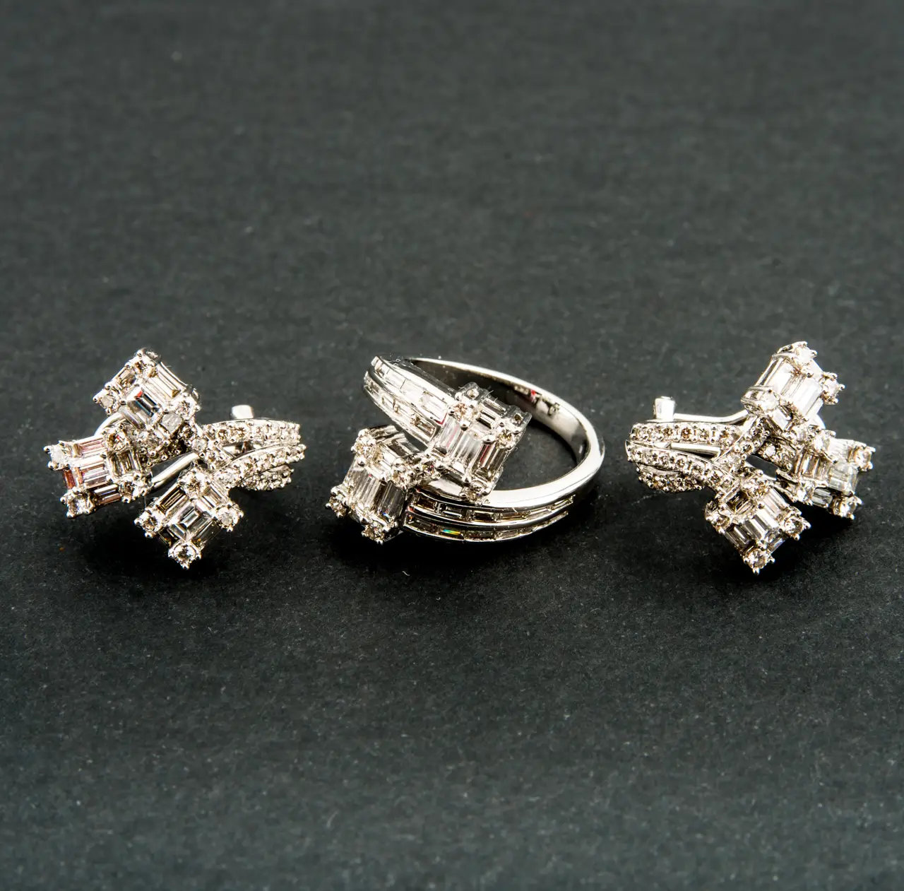 Juego de sortija y pendientes tu y yo de oro blanco y brillantes talla baguette y redondo.