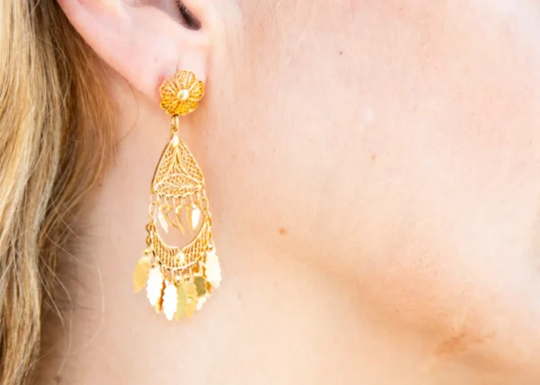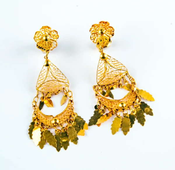 Pendientes largos de hoja oro amarillo de 22 quilates.