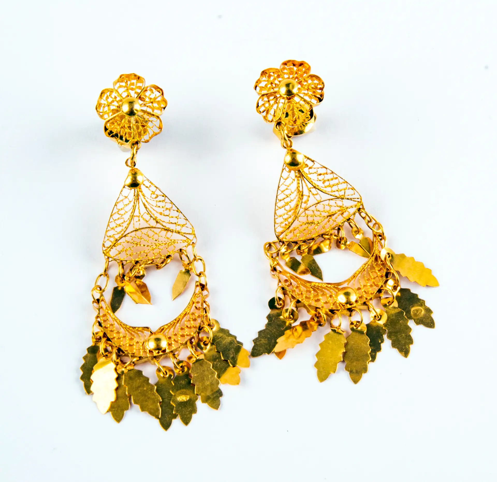 PENDIENTESDE HOJAS LARGOS DE ORO 22 QUILATES.