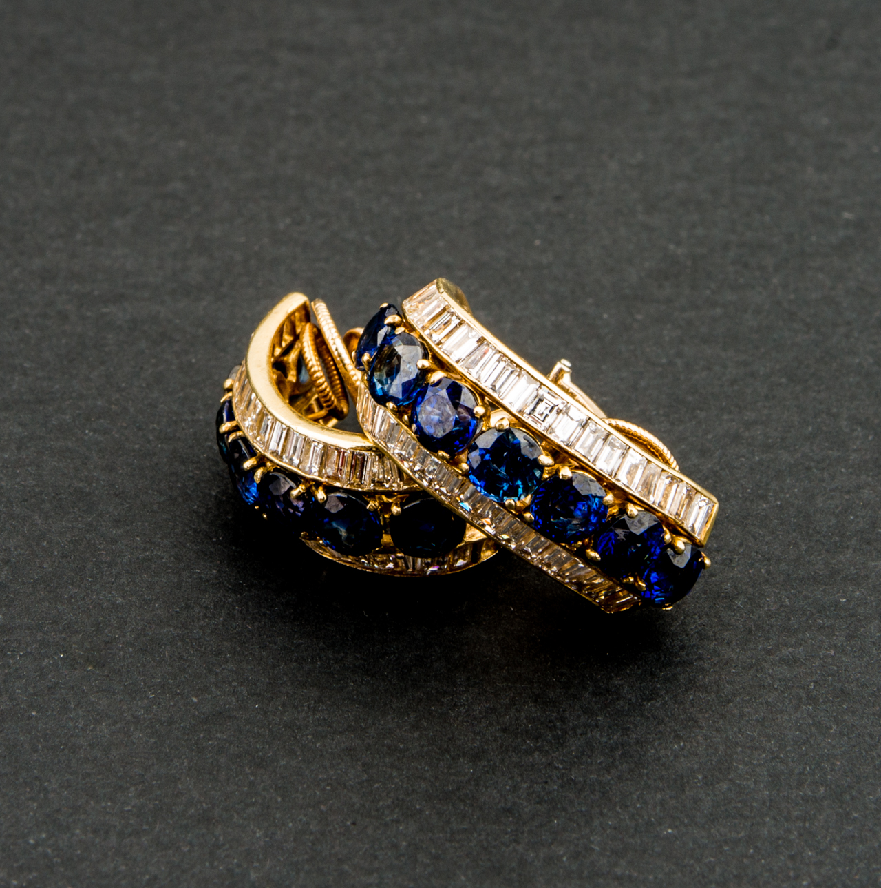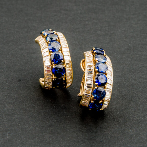Par de pendientes de oro amarillo con zafiros y brillantes baguette