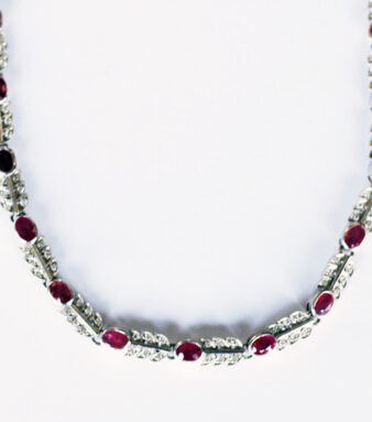 El centro de la pieza está protagonizado por rubíes de intenso color carmín, cuidadosamente engastados para crear un punto focal vibrante, mientras que los diamantes que los rodean aportan brillo, profundidad y sofisticación. El juego de relieves y proporciones otorga dinamismo al diseño, logrando un equilibrio perfecto entre distinción y refinamiento.