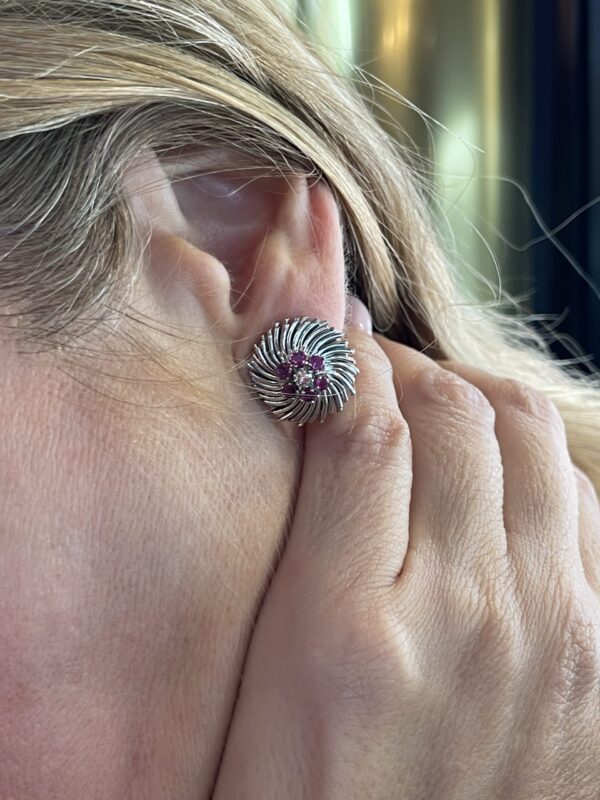 Estos pendientes de oro blanco con rubíes y diamantes destacan por su exquisito diseño en forma de flor estilizada, una composición armoniosa que combina volumen, luz y elegancia clásica.