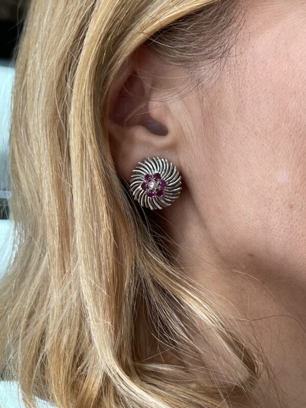 Estos pendientes únicos destacan por su diseño en forma de flor estilizada, elaborada en oro blanco y realzada con un cautivador centro de rubíes de intenso color carmín, acompañados por diamantes que aportan brillo y elegancia.