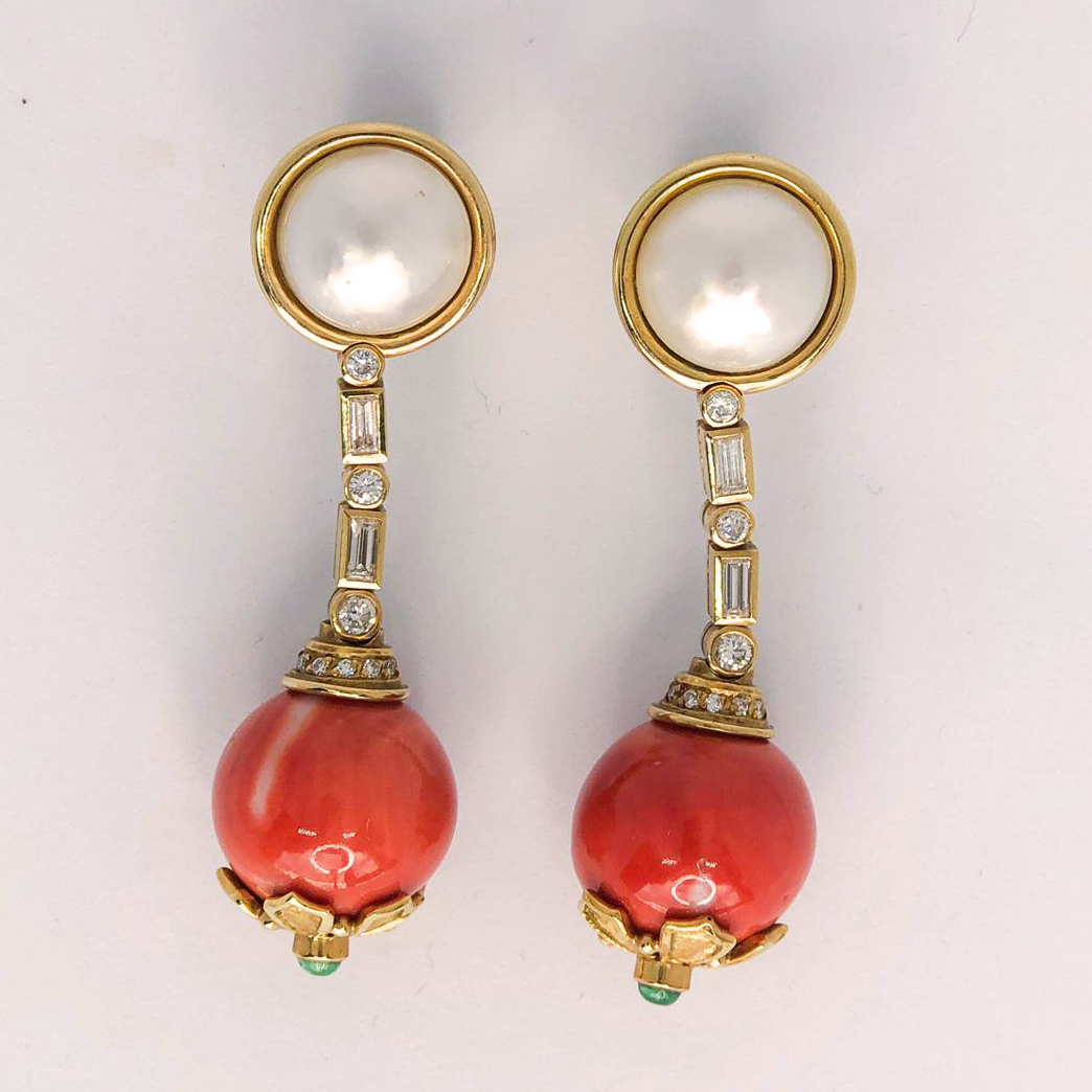 Pendientes de oro con coral, perla y diamantes