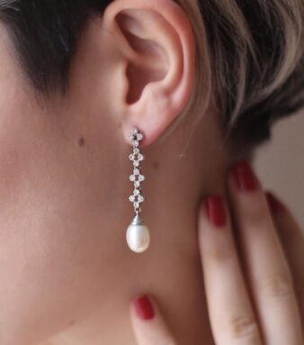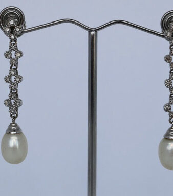 Pendientes isabelinos con lazo, largos de oro amarillo con zafiros blancos.