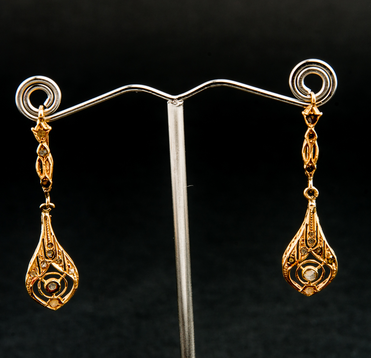 Pendientes isabelinos antiguos de oro amarillo con diamantes.