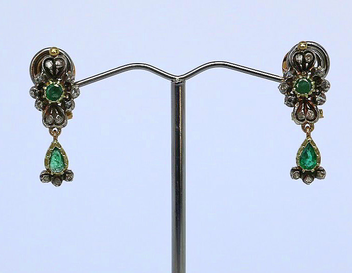 Par de pendientes isabelinos de oro con diamantes y esmeraldas.