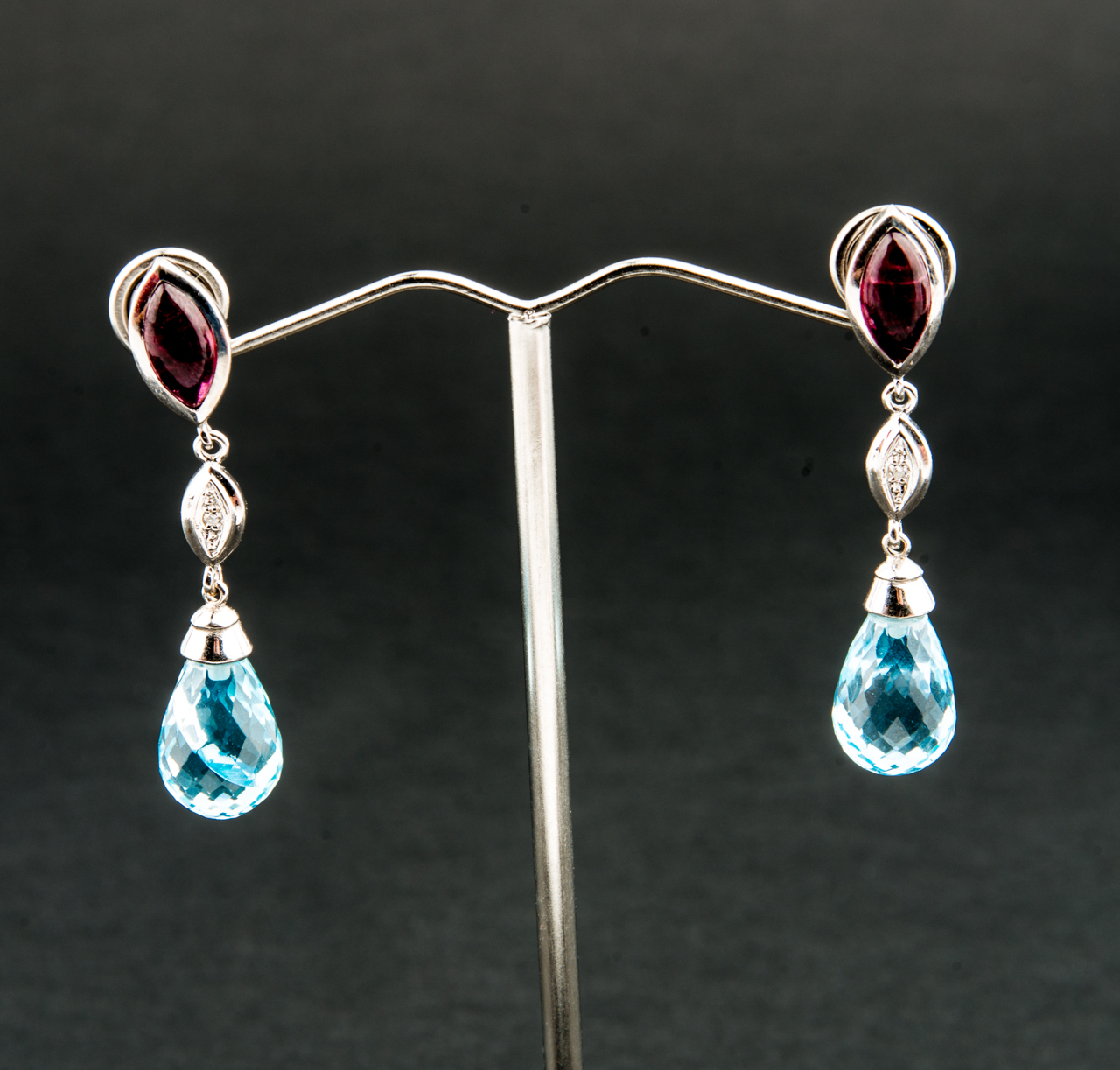 Pendientes largos de oro blanco con brillante topacio azul y amatista