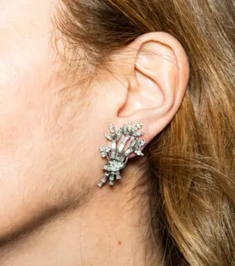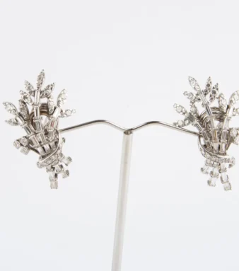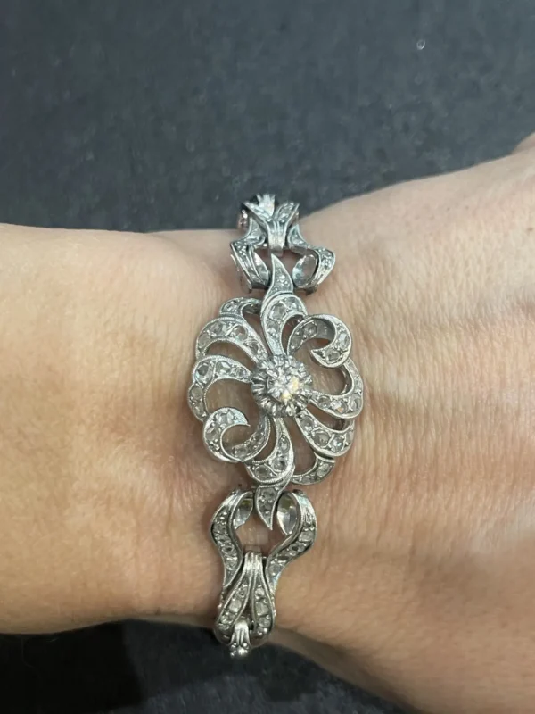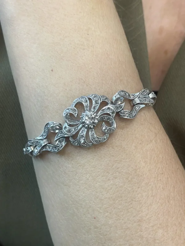 Esta pulsera antigua de pedida de oro y diamantes es una joya cargada de simbolismo y elegancia, creada en la década de los años 50 y elaborada en oro blanco de 18 quilates. Su diseño atemporal refleja la delicadeza y el refinamiento propios de la alta joyería de mediados del siglo XX.
