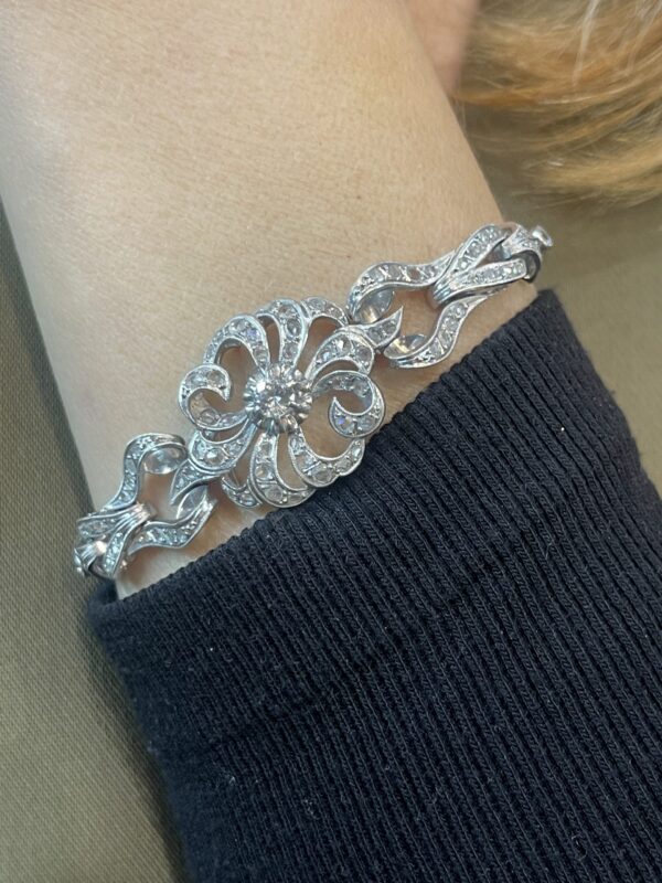 La pieza destaca por el meticuloso engaste de diamantes naturales, cuidadosamente seleccionados para aportar un brillo sutil y exquisito, elegante y equilibrado. Los diamantes se integran con armonía en la estructura de la pulsera, realzando su luminosidad sin restarle sobriedad, característica esencial de las joyas de pedida antiguas.