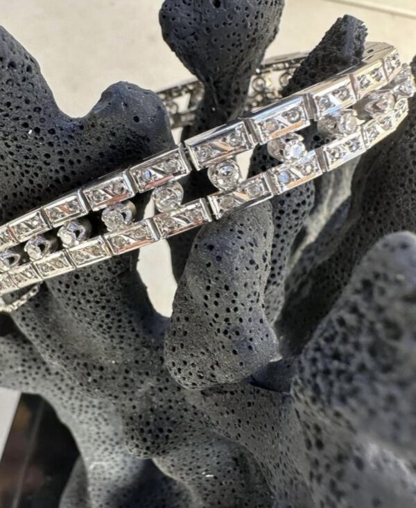 El resultado es una pulsera antigua de diamantes que combina el lujo clásico con la fuerza gráfica y moderna del diseño Art Déco, convirtiéndose en una joya atemporal, elegante y con una presencia imponente. Ideal tanto para coleccionistas de alta joyería como para lucir como pieza protagonista en ocasiones especiales, aportando distinción y carácter.