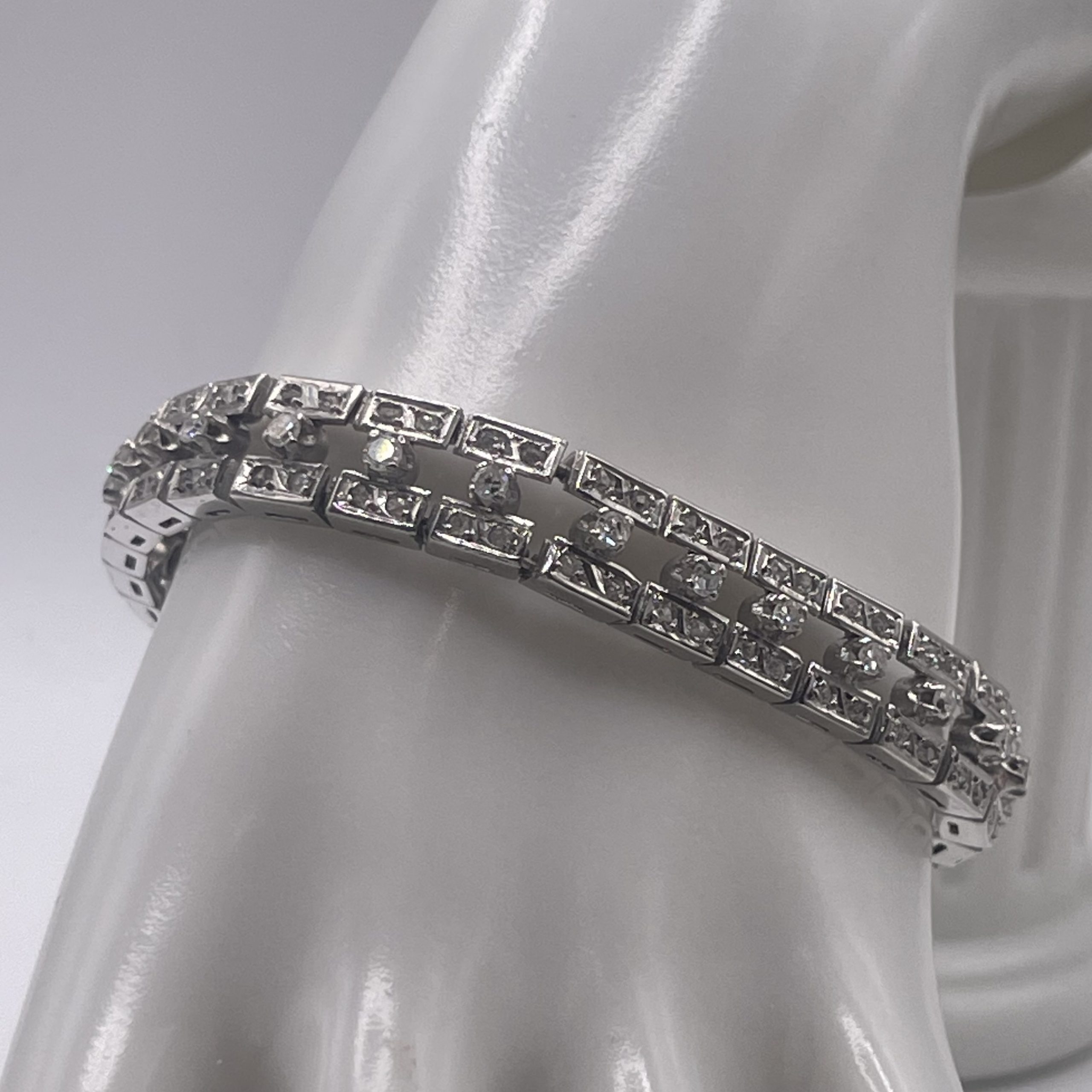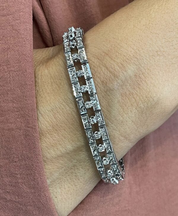 Esta pulsera Art Déco en oro blanco con diamantes es una joya de gran sofisticación, realizada en oro blanco de 18 quilates y concebida bajo los códigos estéticos más representativos del movimiento Art Déco de los años 20 y 30.