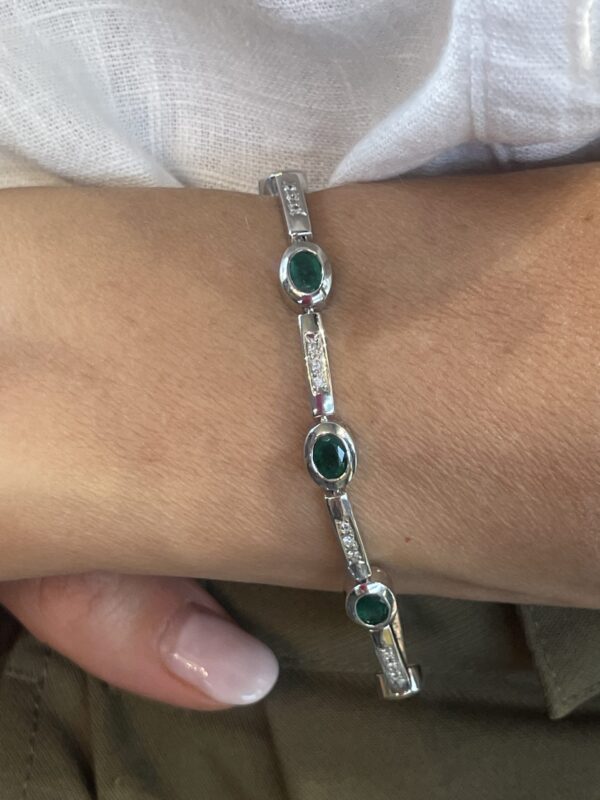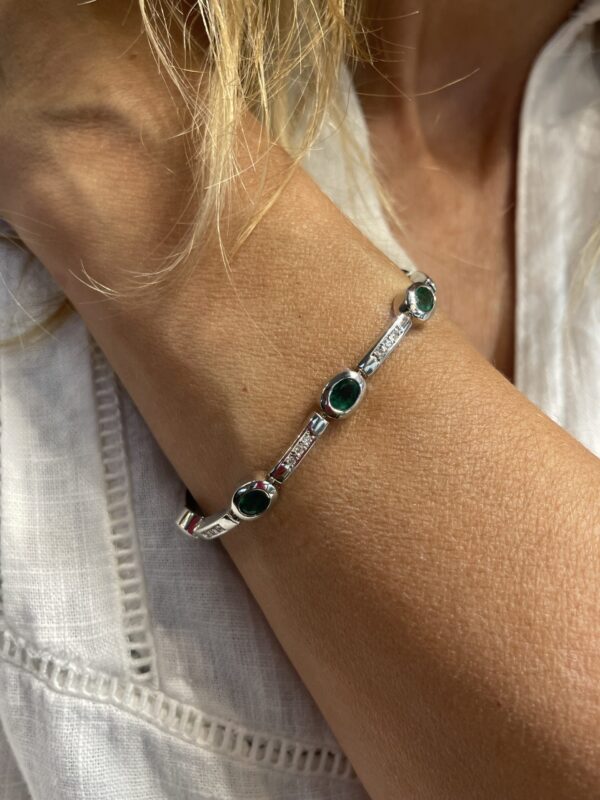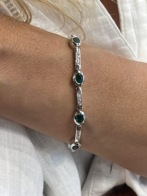 La pieza está engastada con esmeraldas naturales talla oval, de intenso color verde, que se alternan armoniosamente con diamantes talla brillante, aportando destellos de luz que realzan la belleza de cada gema. El contraste entre la sobriedad del oro blanco, la viveza de las esmeraldas y el resplandor de los diamantes da lugar a una pulsera refinada y muy versátil.