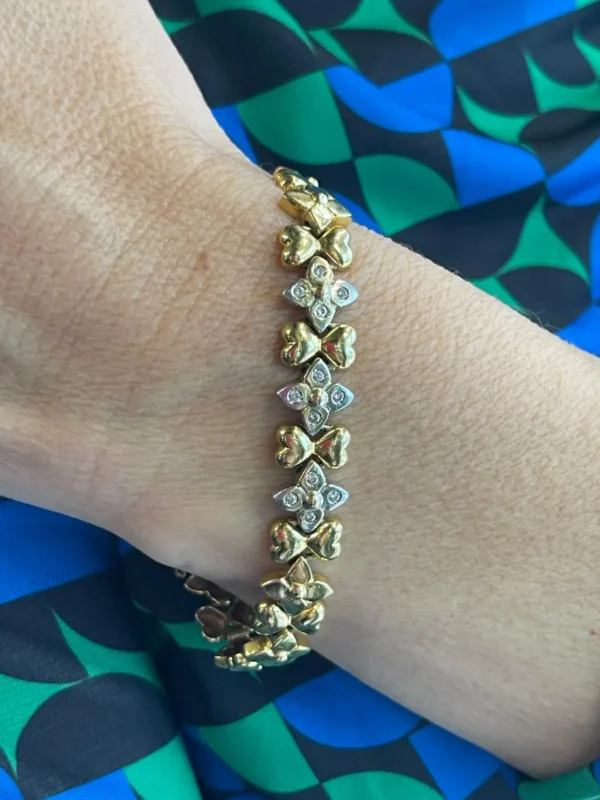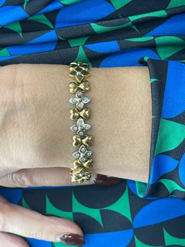 Elegante pulsera de oro amarillo y oro blanco con diamantes, una joya sofisticada que combina contraste, brillo y diseño refinado. Perfecta para quienes buscan una pieza exclusiva que destaque tanto en ocasiones especiales como en el día a día.