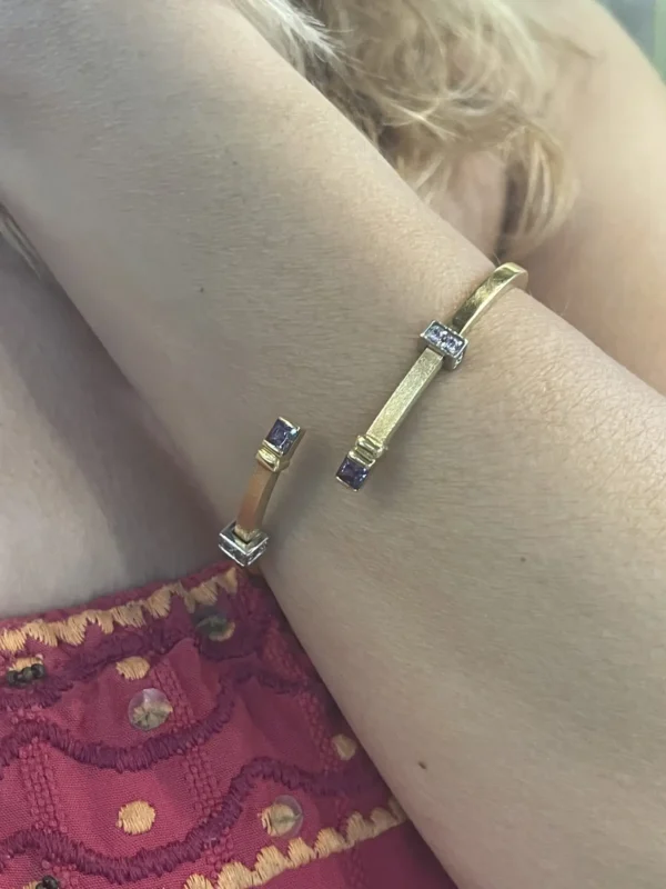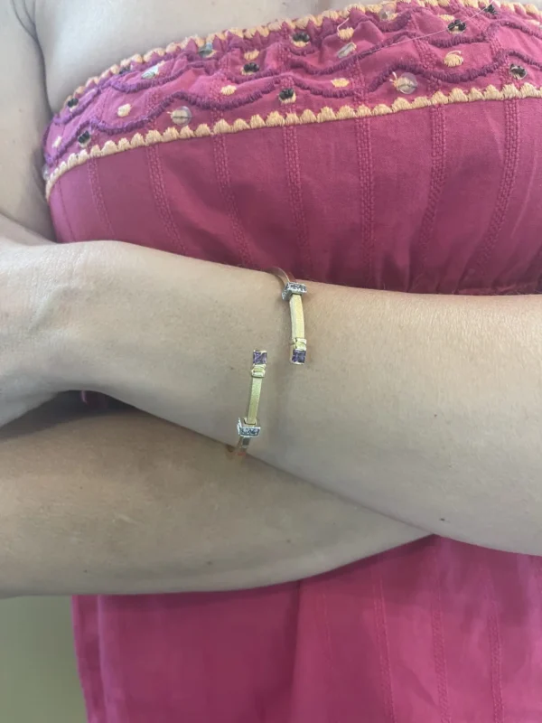 Pulsera de oro amarillos de 18Kts con amatistas y diamantes.  Tiene un diseño original que combina el oro amarillo con las piedras preciosa haciendo un bonito contraste.