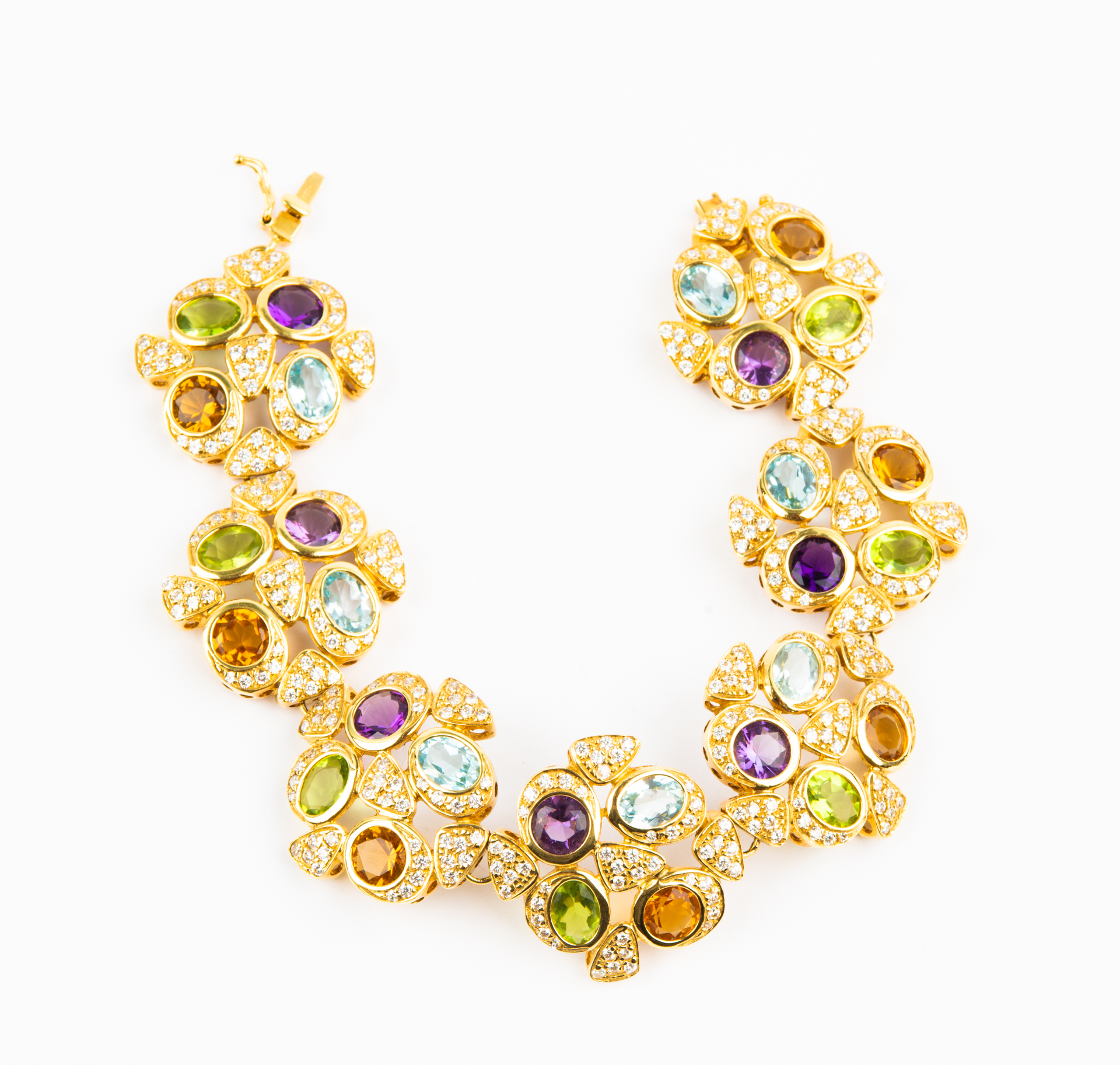 Pulsera moderna de oro amarillo de ley 18 quilates con piedras de colores.