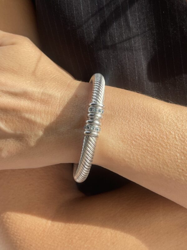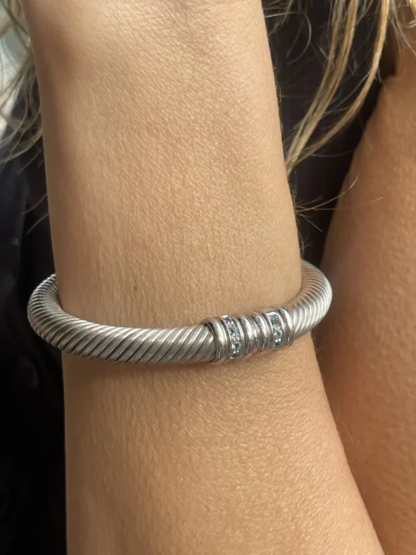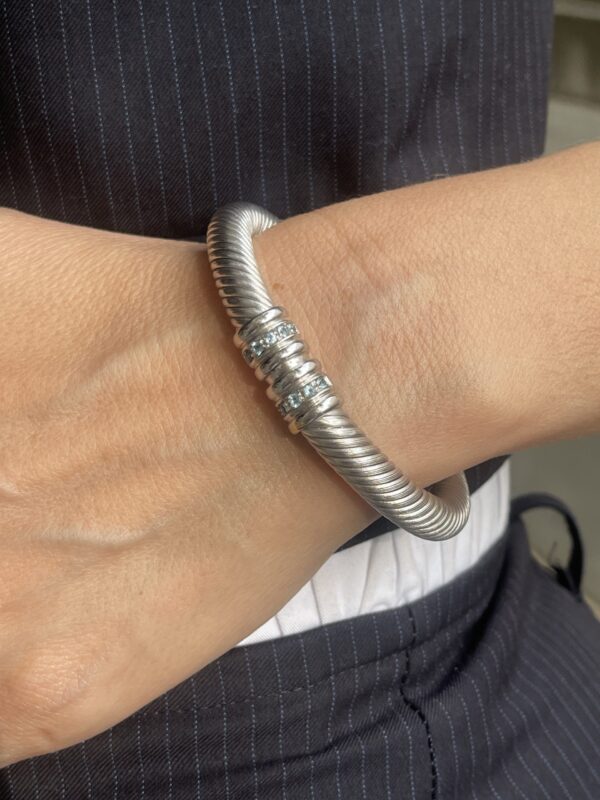 El motivo central, adornado con piedras azules engastadas en hileras paralelas, introduce un delicado contraste cromático que realza la sobriedad del oro blanco y añade un punto de distinción a la pieza. Su forma abierta, sólida y equilibrada, la convierte en una pulsera cómoda y versátil, perfecta para lucir sola o combinada con otras joyas.