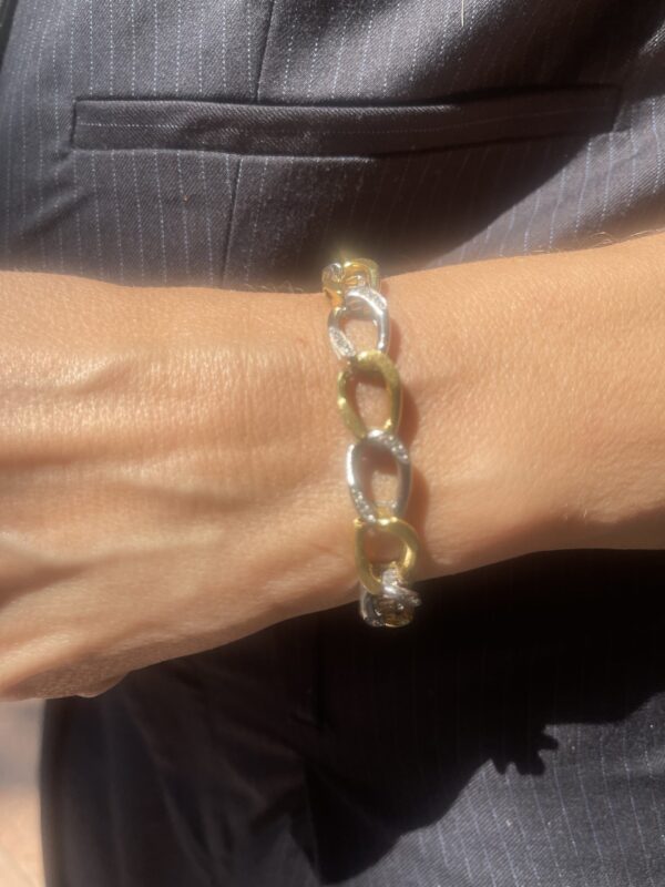 Esta pulsera vintage bicolor de oro y diamantes es una joya de sofisticación atemporal, diseñada para quienes valoran la elegancia clásica con carácter propio. Su delicado diseño está compuesto por eslabones entrelazados realizados en oro amarillo y oro blanco, creando un juego de contrastes armonioso, refinado y muy luminoso.