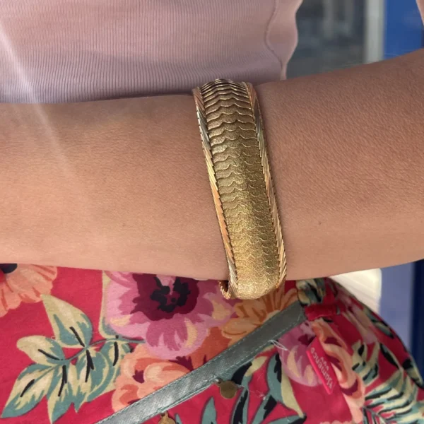 Esta pulsera vintage de oro con textura escamada es una pieza imponente y llena de carácter, realizada en oro amarillo y concebida para quienes valoran la elegancia del pasado y el diseño con personalidad.