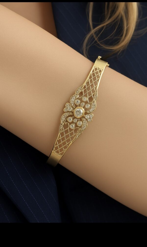 El diseño central está protagonizado por un diamante redondo de gran luminosidad, rodeado por pequeños diamantes que evocan pétalos en flor, creando una composición armoniosa, equilibrada y profundamente femenina. Cada detalle de esta pulsera antigua de oro revela la maestría joyera de una época en la que la artesanía y la belleza eran esenciales.