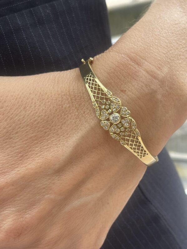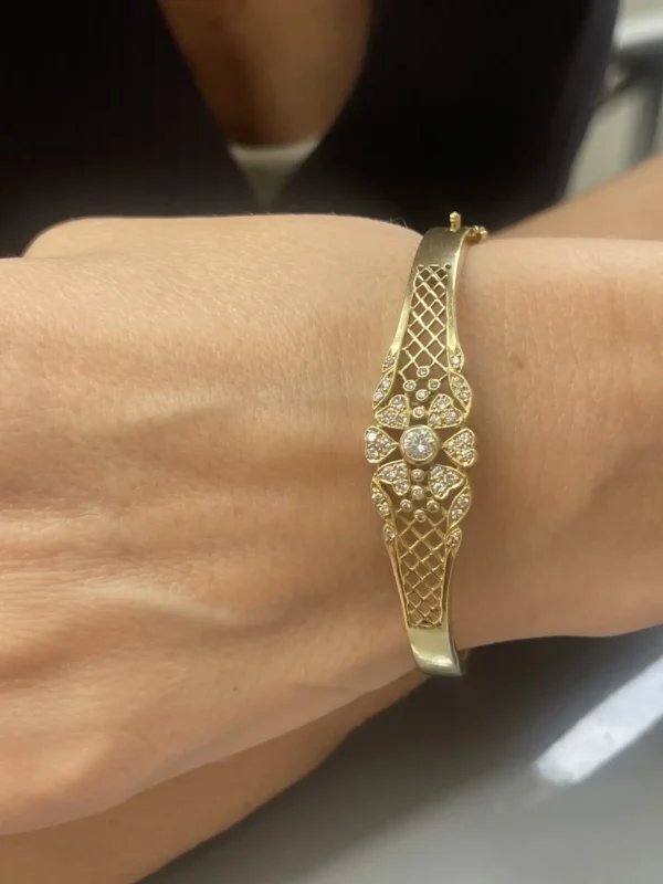 Esta pulsera vintage de oro y diamantes es una joya exquisita que refleja toda la delicadeza, el romanticismo y la elegancia de la época Belle Époque. Realizada en oro amarillo calado, presenta una ornamentación de inspiración floral cuidadosamente trabajada, que destaca por su finura y riqueza artesanal.