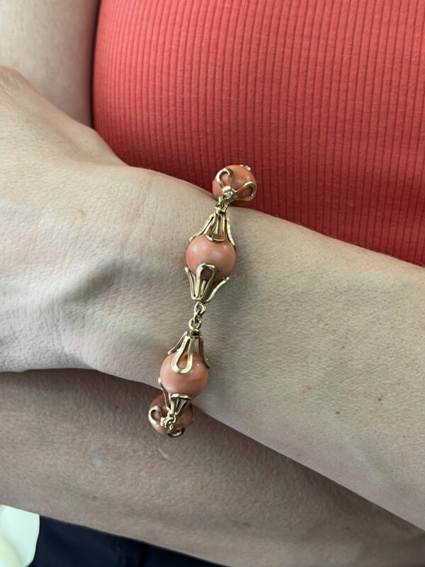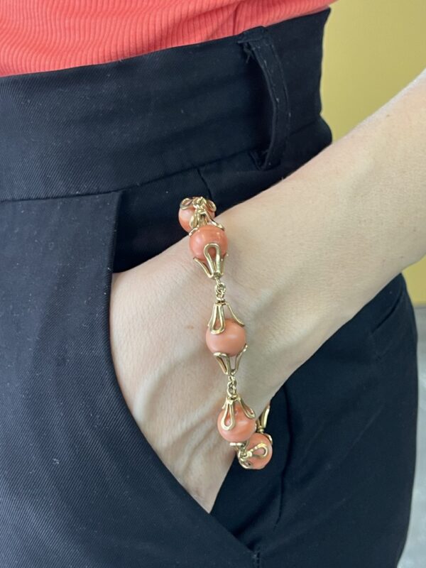 Esta pulsera vintage de oro y coral de 1950-1960 es una joya delicada y refinada, elaborada en oro amarillo de 18 quilates, que refleja con fidelidad el gusto elegante y femenino característico de la alta joyería de mediados del siglo XX.