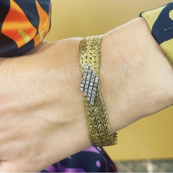 En la parte central de la pulsera se aprecia una delicada composición geométrica, cuidadosamente engastada con múltiples diamantes talla brillante, dispuestos en cinco hileras diagonales que atraviesan la pieza aportando un destello luminoso y refinado. Este contraste entre la calidez del oro amarillo y el brillo de los diamantes realza la profundidad del diseño y subraya su estética vintage.