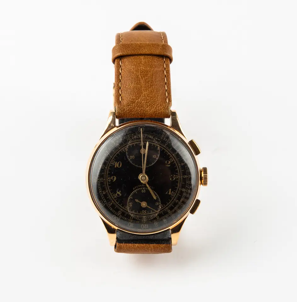 Reloj cronógrafo antiguo con esfera negra en oro rosa