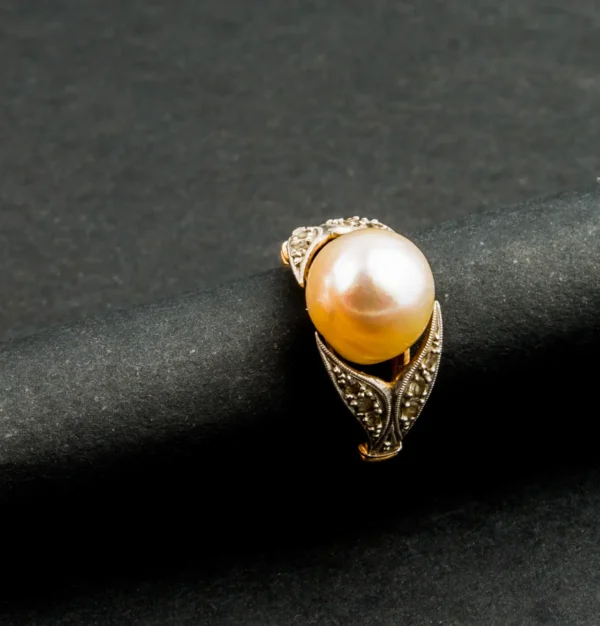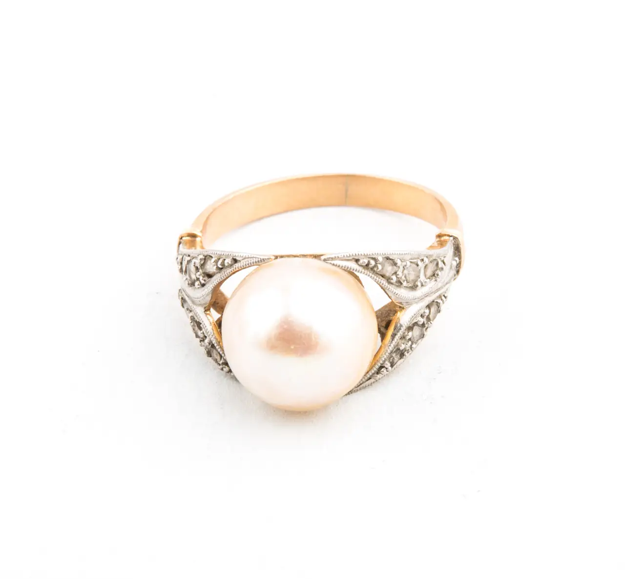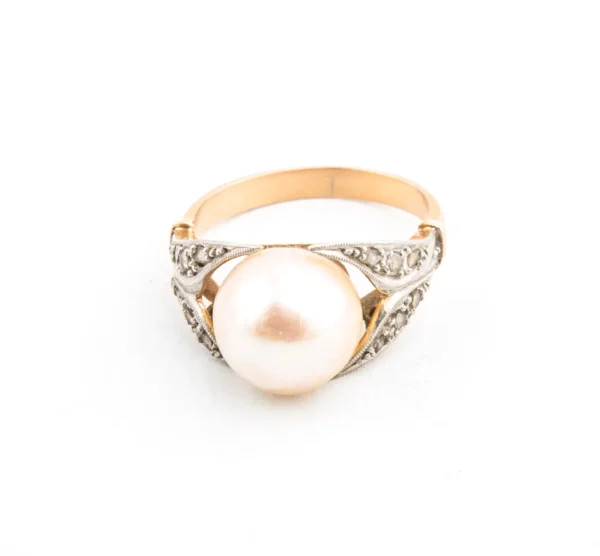Sortija antigua bicolor con diamantes y perla cultivada.