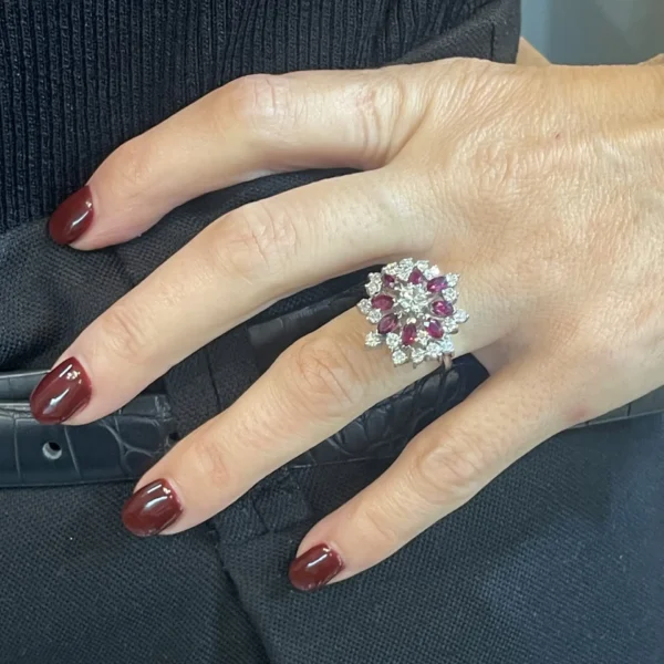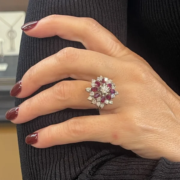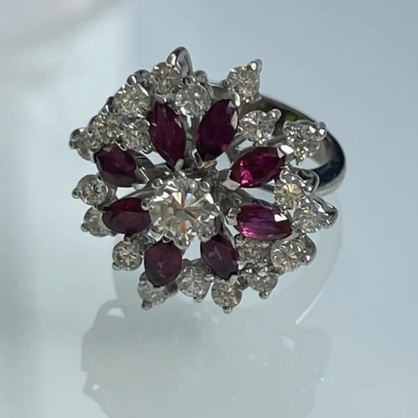 Magnifica sortija antigua de diamantes y rubís en oro blanco de 18k tiene veinte diamantes, ocho rubís y un diamante central.