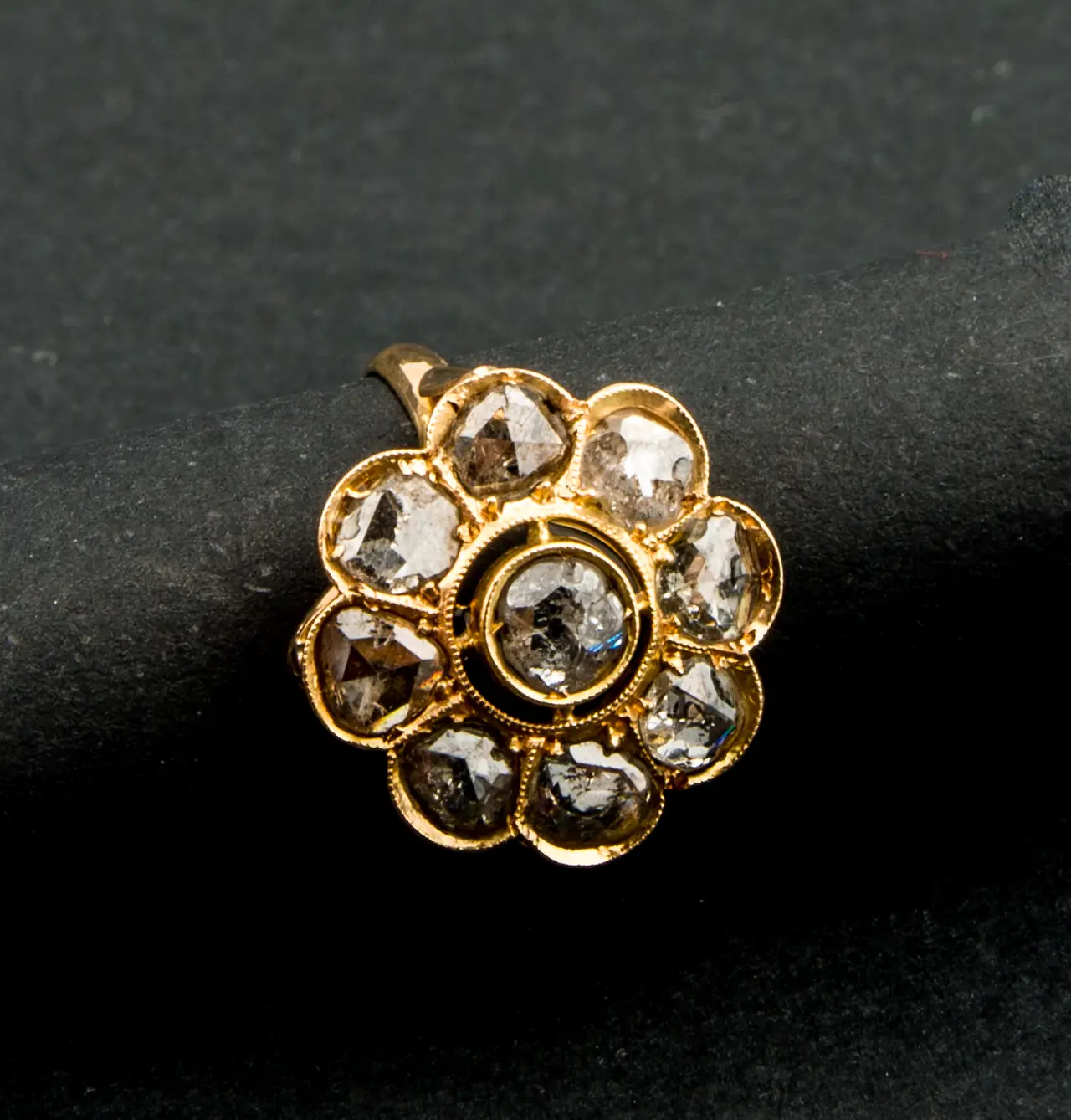 Sortija antigua de oro amarillo con orla de diamantes.