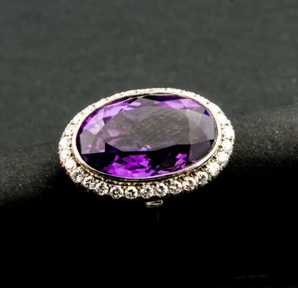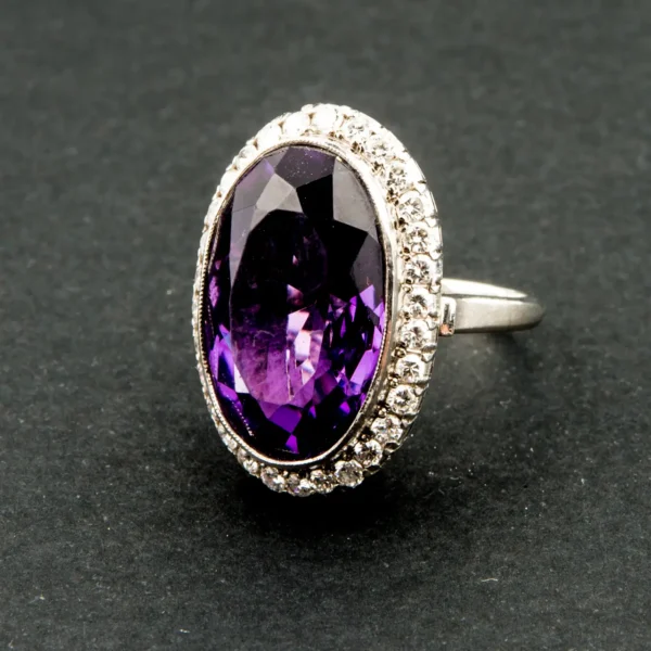 Sortija antigua de oro blanco con brillantes y amatista