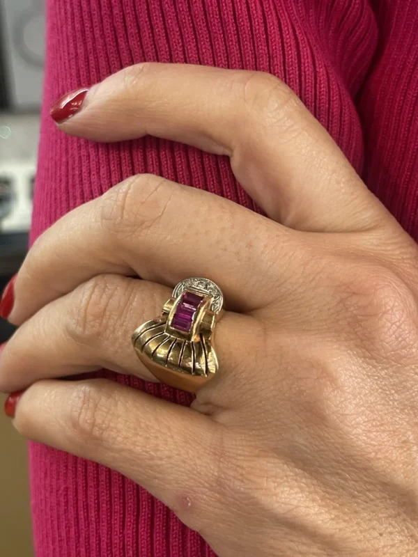 Sortija Chevalier vintage , de oro con rubís y diamantes.