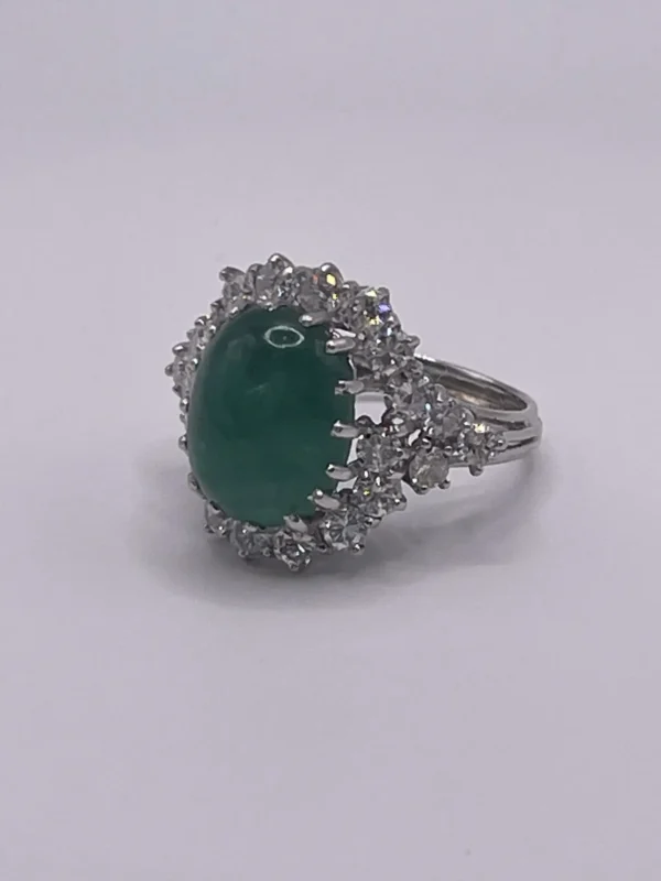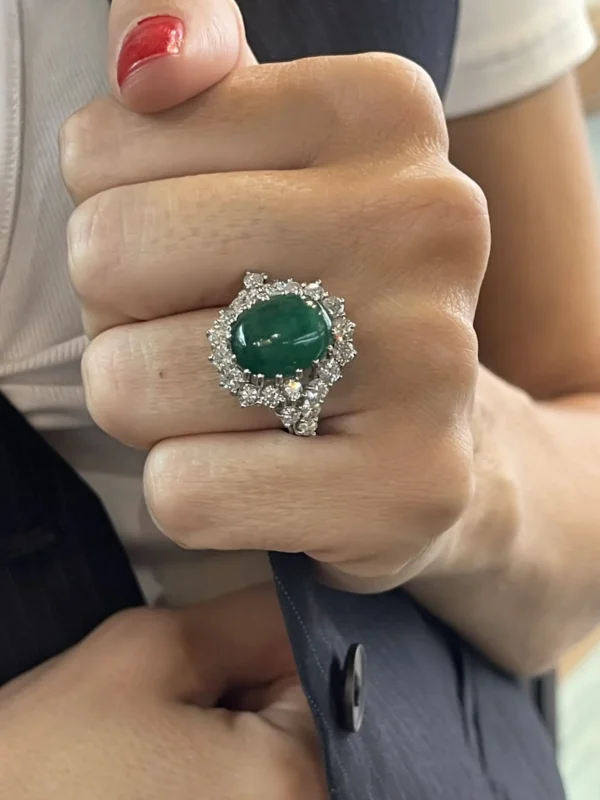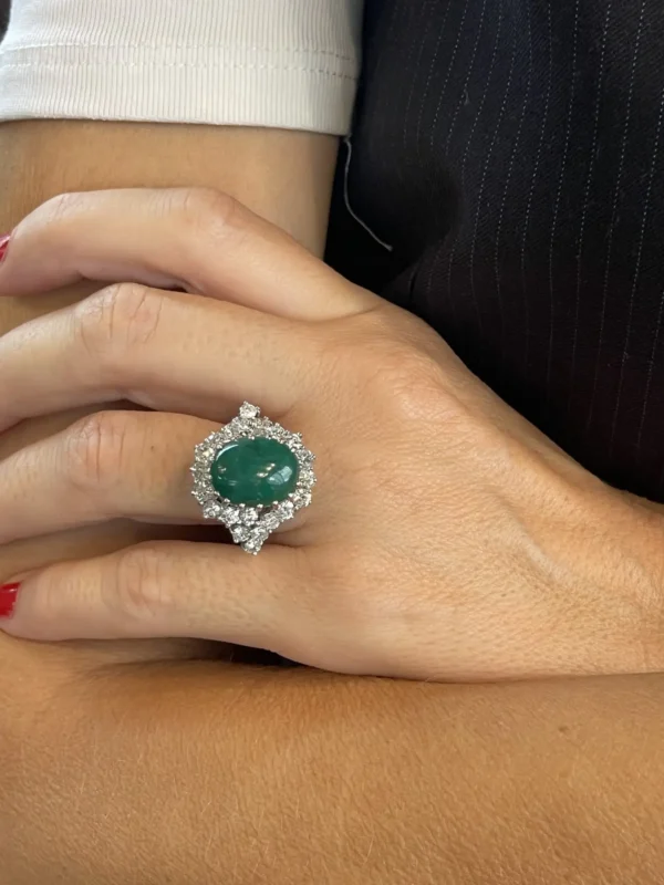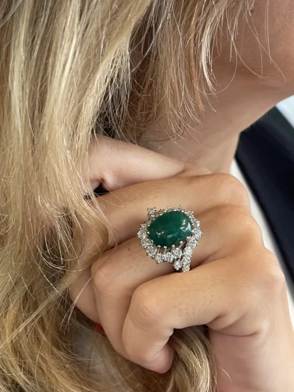 Sortija de oro blanco con esmeralda y brillantes de precioso color. Para ensalzar la esmeralda colombiana, se ha jugado con diamantes medianos de extraordinaria calidad.