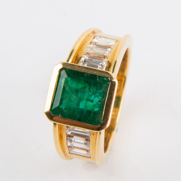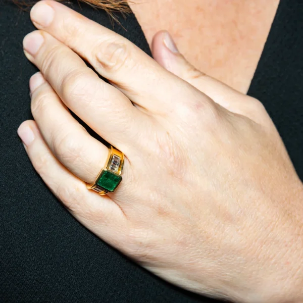 Sortija de oro amarillo de 18 quilates con diamante baguette y una esmeralda central.