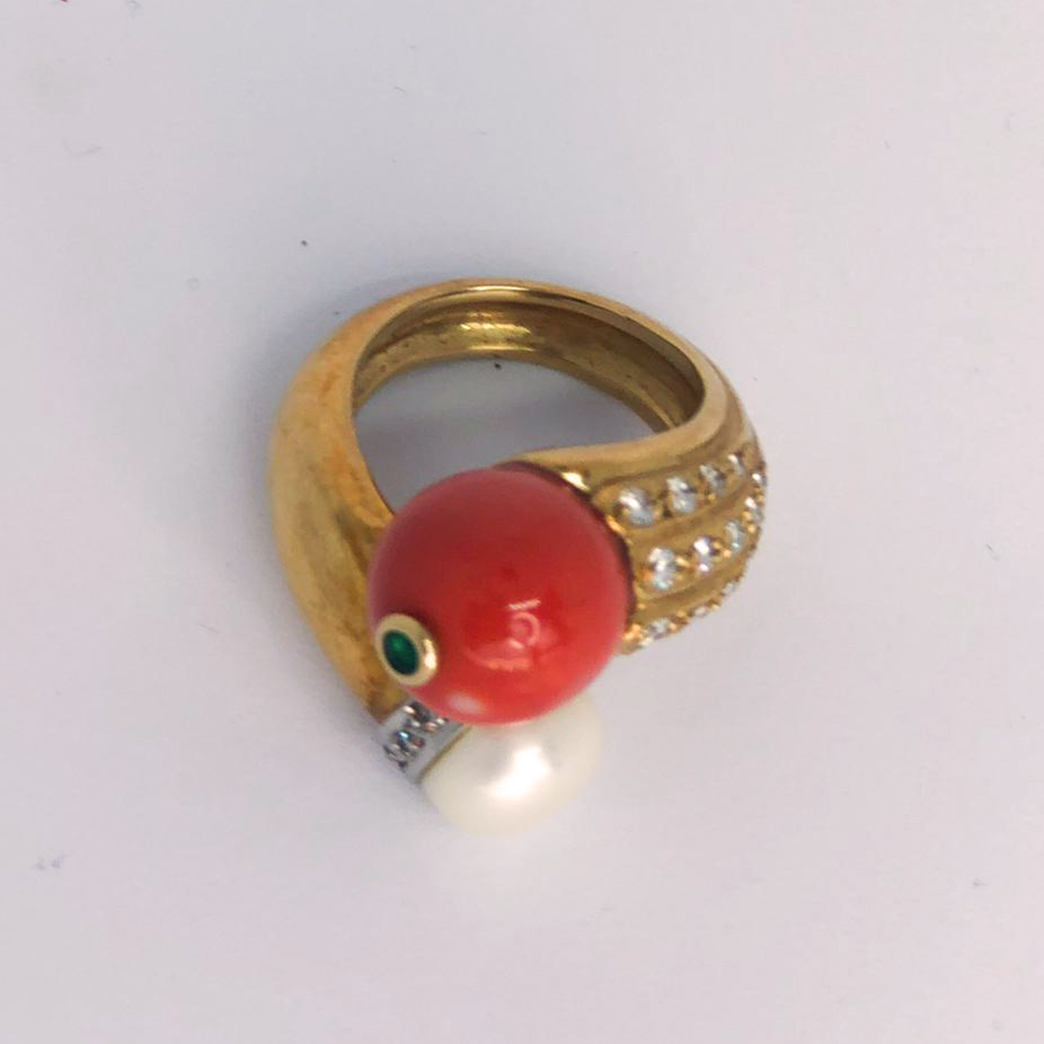 Sortija de oro amarillo con coral natural y brillantes.