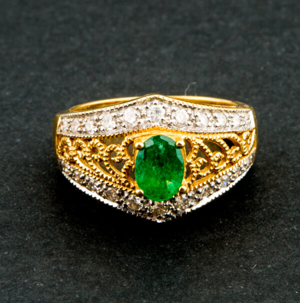 Sortija de oro amarillo con esmeralda y brillantes